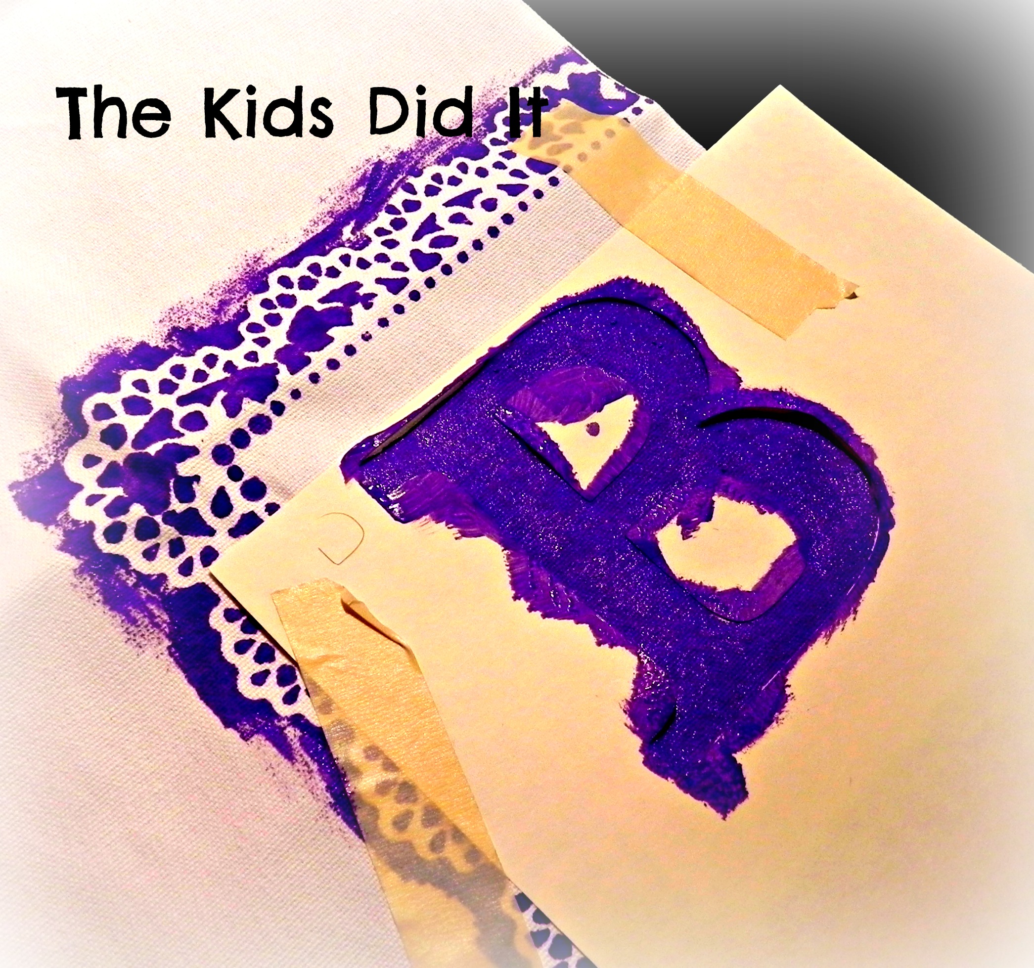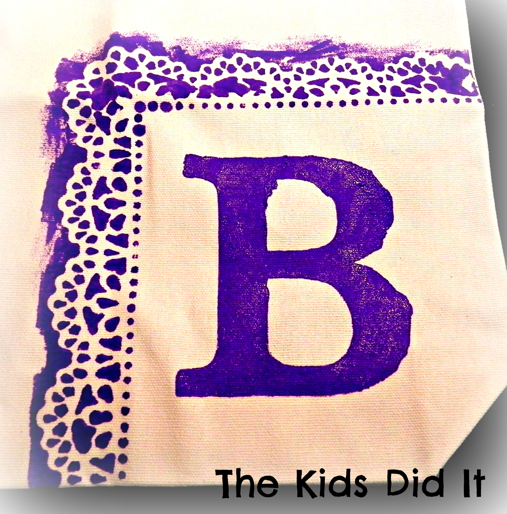 Once you’ve figured out the size you will need, let’s prepare your letter stencil or mask. I recommend using a fairly basic block style letter. I’ve tried using calligraphy style letters and also some swirly style letters and they don’t turn out quite as nicely. Too much small detail. Plus the sturdy block style letters contrast nicely with the lacey doilie edges.  I have tried making my stencils/masks a few different ways. You can always freehand your letter onto the bag and paint it in. For me this was too time consuming and I could never get the letter to look the way I wanted it to. I have also tried printing out a large letter on my computer, cutting out the letter (tossing it) and using the negative as my stencil. That actually worked out nicely, especially when I printed the letter out on cardstock (a little stiffer than regular computer paper makes the painting easier). So my next idea was to cut the letter out on a die-cut machine (I’m lucky enough to have a Cricut but I think any machine would work), toss the actual letter and again use the negative for your stencil.