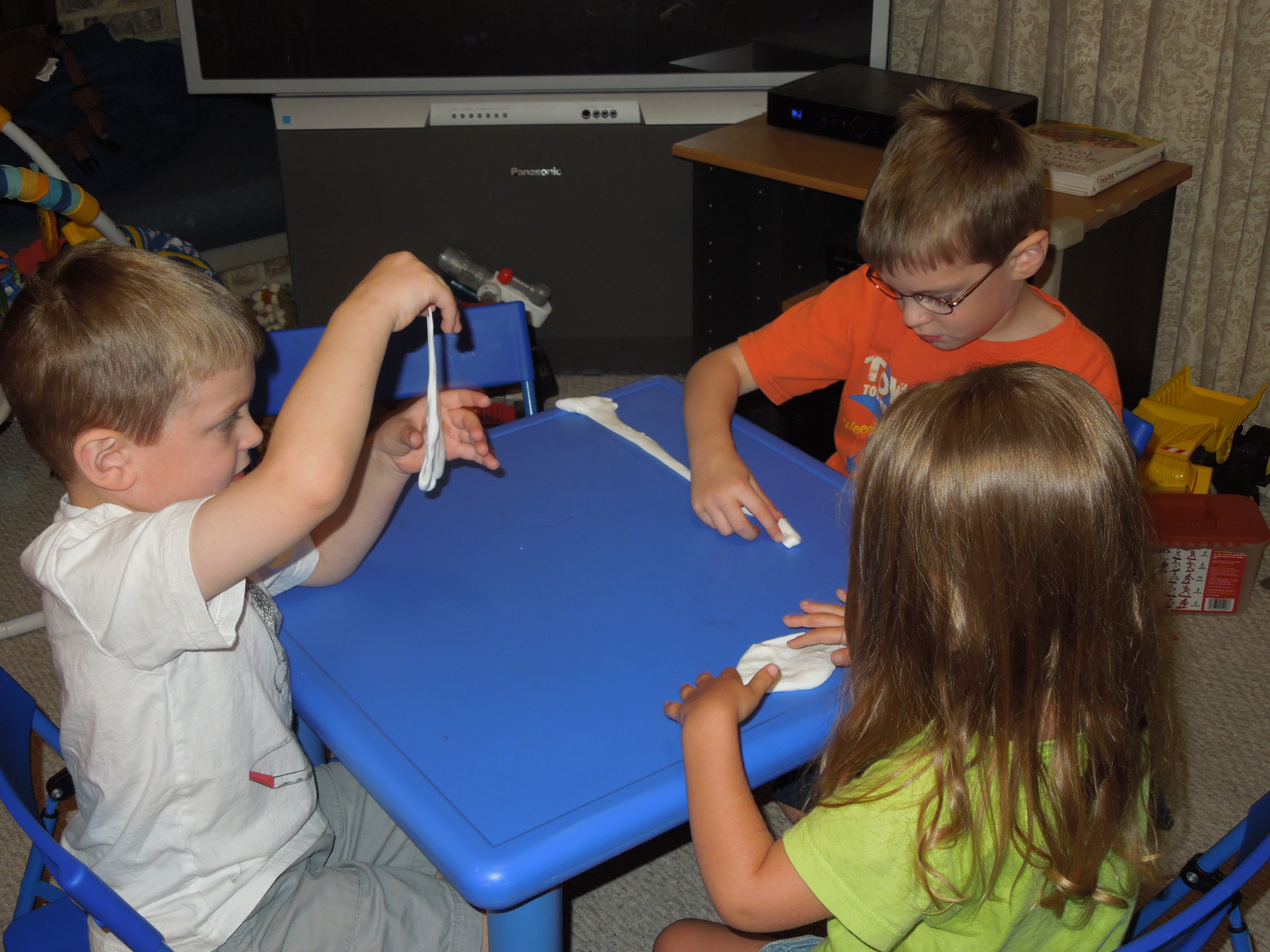 5.) Enjoy! Note: We made blue but it was dying our hands blue so we re-made it using no food coloring and the kids enjoyed it just as much. If it seems too sticky add more liquid starch.