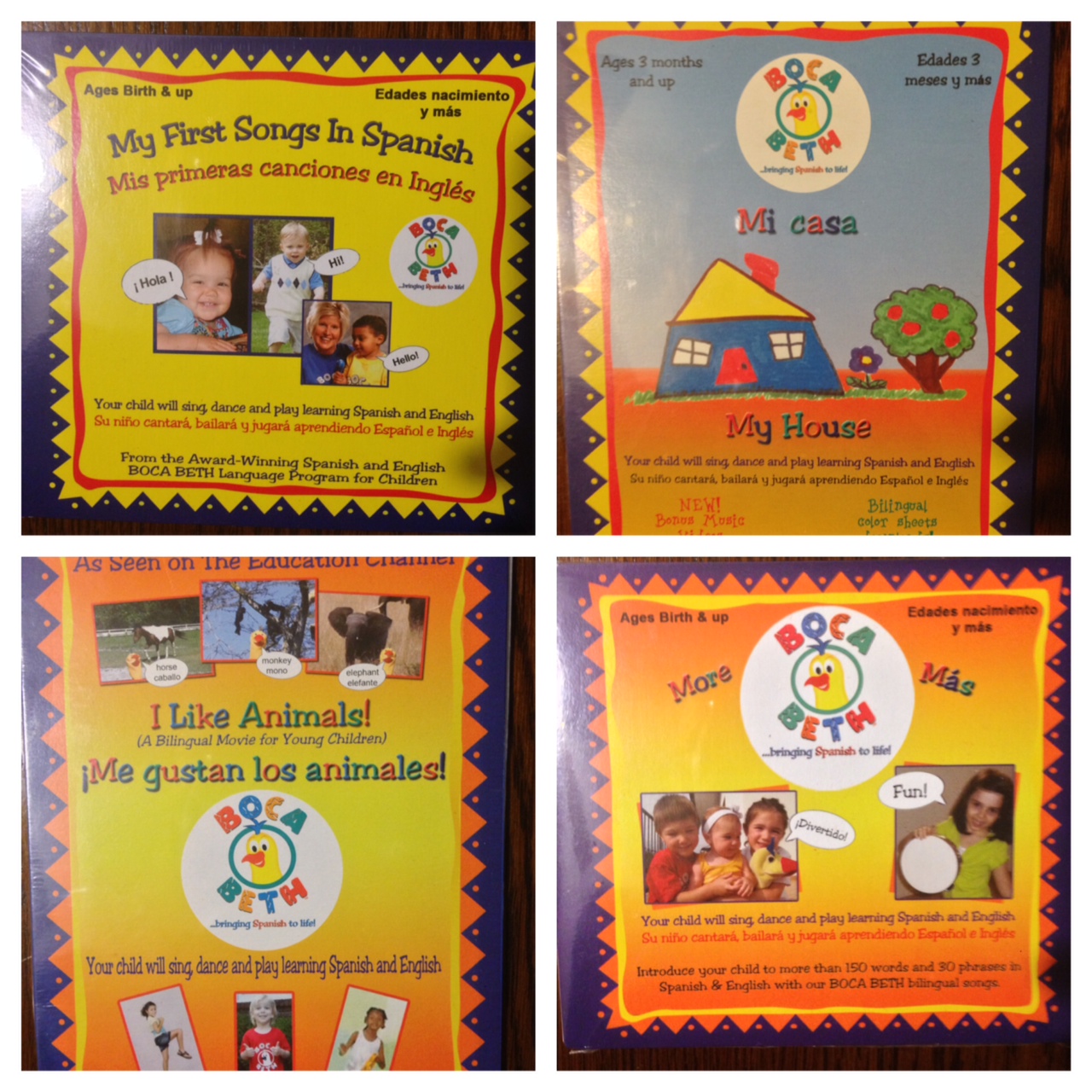 Boca Beth is an award winning program that teachers your child Spanish or English. It is recommended for ages birth through eight. Their use of music and movement keep children engaged and make learning fun. There are over seven hundred and fifty words and over two hundred and fifty phrases taught with these products.