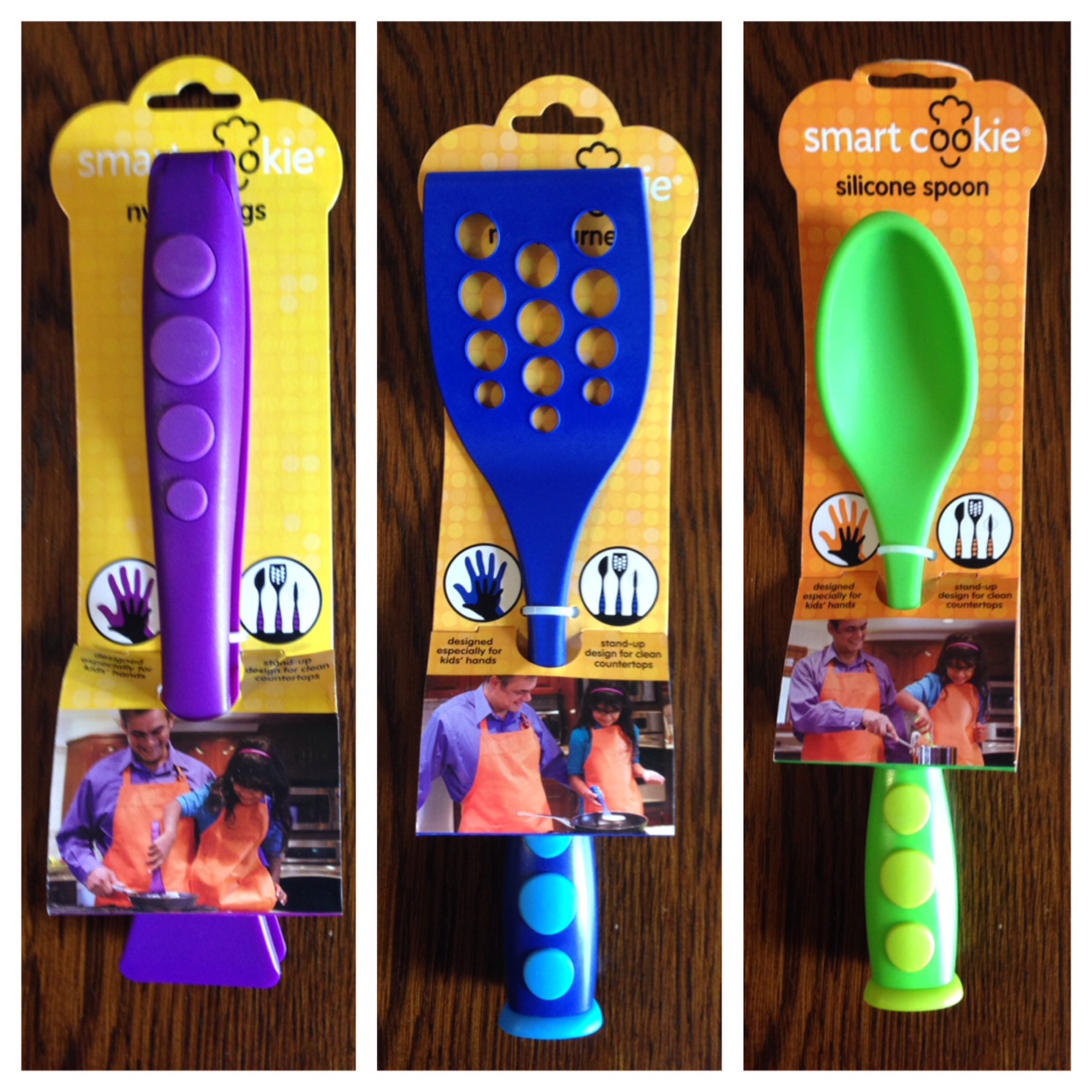 My children and I were so excited to try our new products. I received the Smart Cookie nylon thongs, nylon turner and silicon spoon. These are great products! The handles are nice are thick which make them great for little hands. Each of these items have silicone grips which make them safe to children to use. The silicone spoon was perfect for my two and half year old daughter who loves to help me in the kitchen. I always give her the task of mixing so this came in very handy. One of my favorite features of this item (and many of the Smart Cookie items) is it has a stand-up design which helps keep the counter tops stay clean! I am constantly cleaning up as I go in the kitchen and these kitchen utensils make it a little easier to cook without making such a mess.