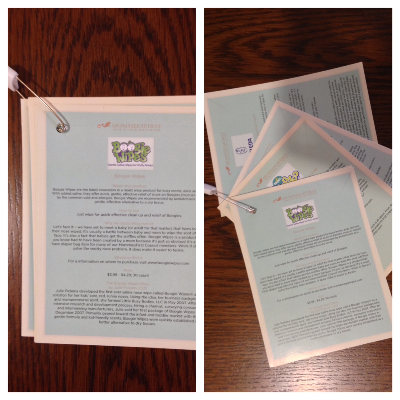 MommiesFirst includes an awesome information card clipped together with an adorable oversized safety pin. (I love their attention to detail). There is an information card for each product received explaining the product, how to use the product, where to buy the product, price of the product and a little history of the company behind each product.
