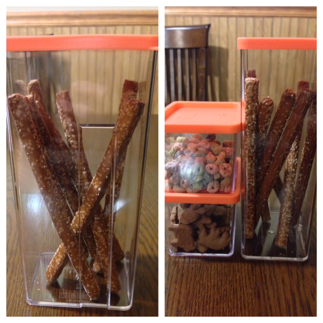 I received the ten piece set of containers which include three fourteen ounce, one twenty-seven ounce and a forty-two ounce container and lids. I had been looking for some good containers (but couldn’t find any I really liked) so as soon as I received I quickly started using them. I really love that these are stackable. I also noticed that even though they do stack, they are also very easy to take apart; you simply tilt the container side ways to separate. These are so nice looking that I don’t even mind leaving these out on my counter. It’s so convenient that they are clear so that I can see what is inside. The forty-two ounce container is perfect for pretzel rods. My toddlers love these for a snack so now I can have them easily available for them. I designated a small space on my counter for my children’s snacks that I included in these containers. These are great for portion control with children. These are also (top rack) dishwasher save which makes me love them even more!